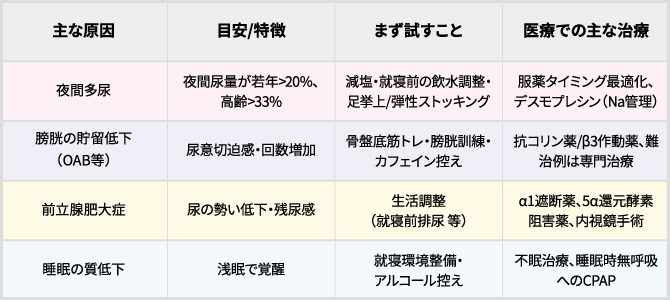 生活指導、必要に応じてCPAPなどの治療で夜間覚醒を減らします。 - 便秘·膀胱炎など合併症があれば先に治療すると膀胱症状が改善することもあります。
